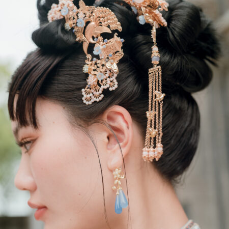 Harmonious Crane Pagoda Ornament Hairpin – Gold, Pink (Left) Rent from Rp2.690.000