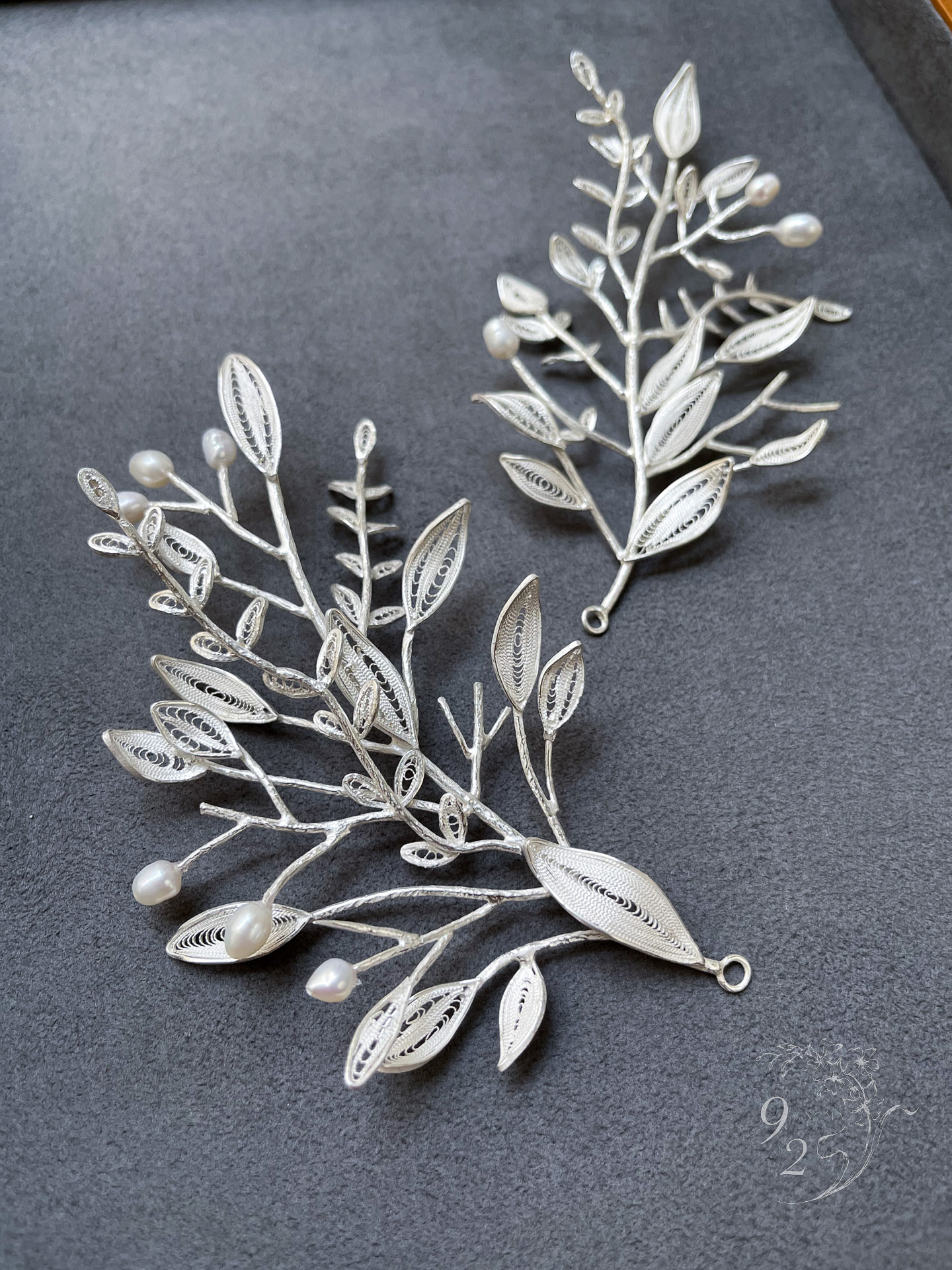 Round Leaves with Pearls Hairpiece – Unplated Silver