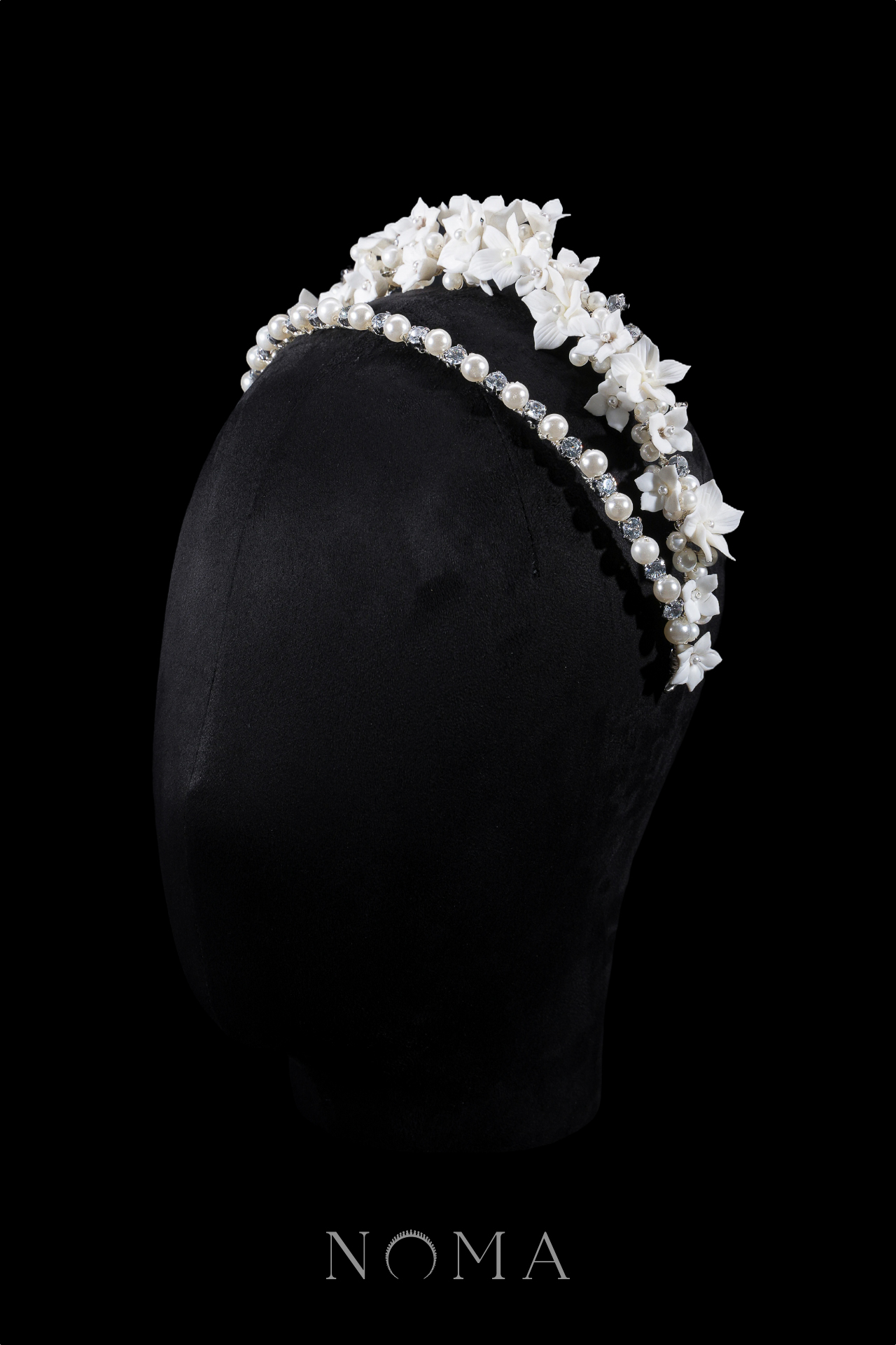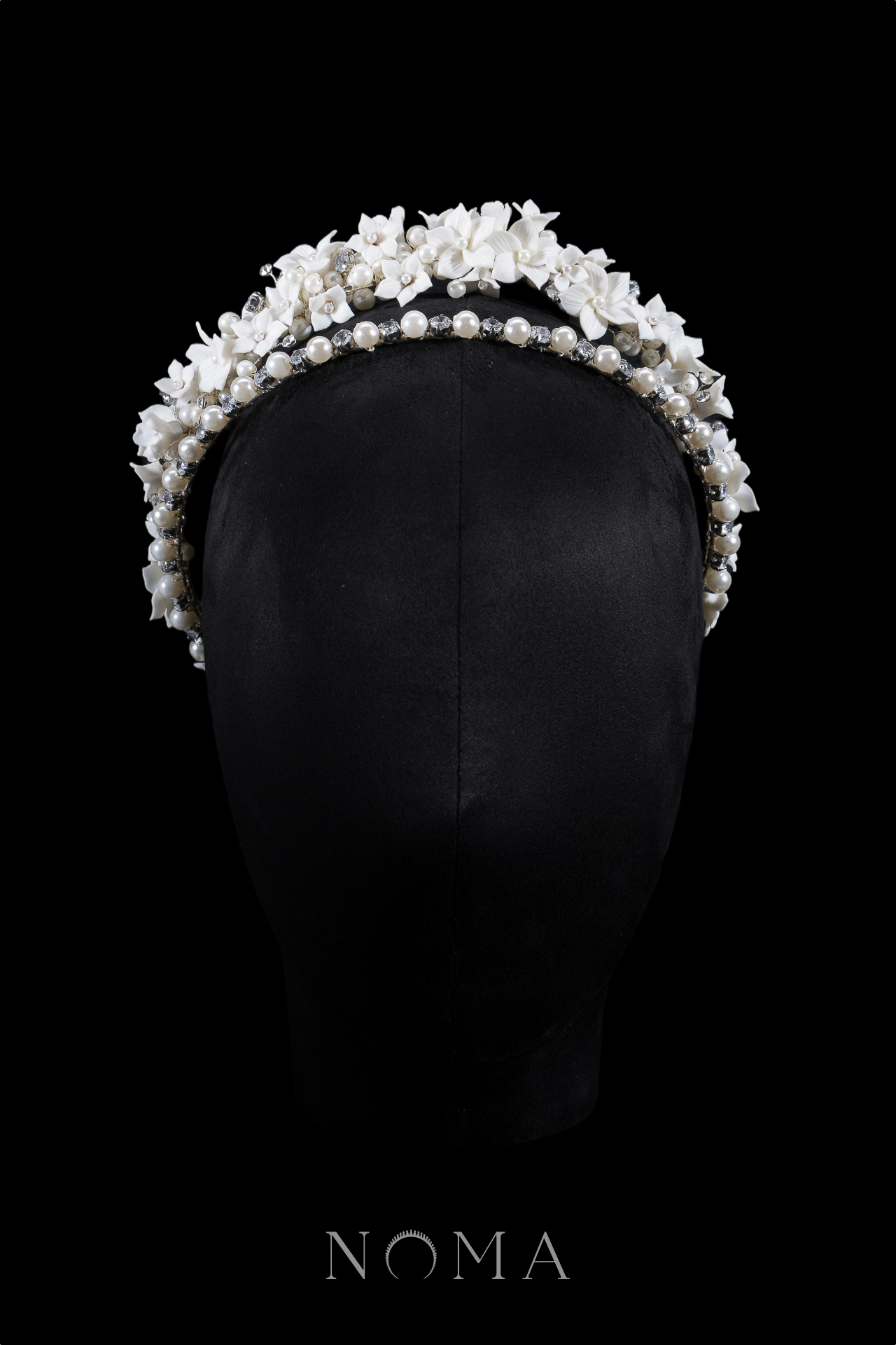 Clay Flower Jasmine Pearl Crystal Crown – White Silver