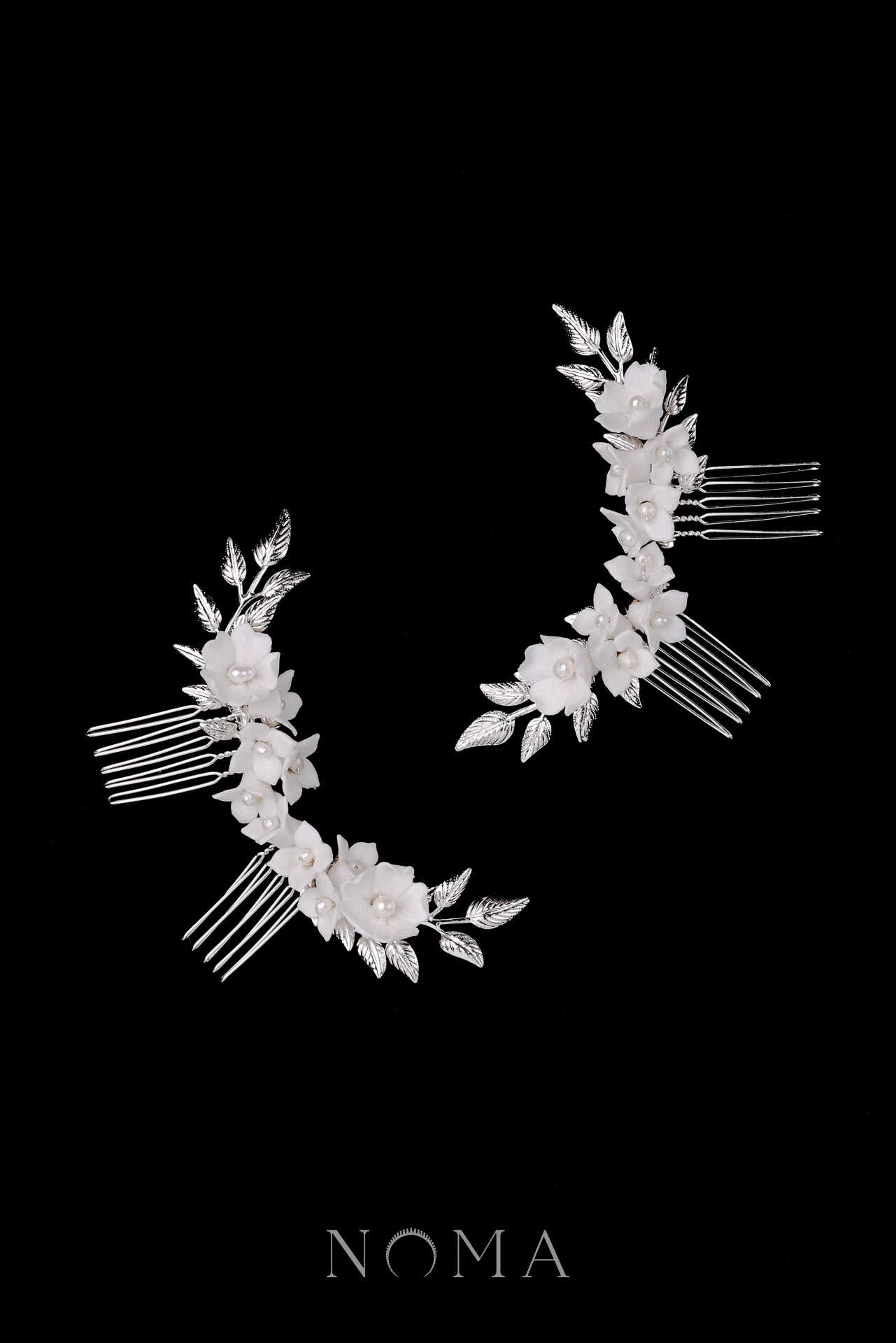 Clay Flower Little Side Hairvine Pair – White Silver (1 pair)