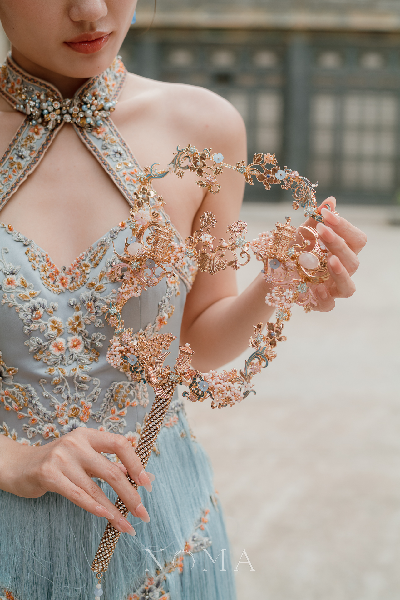 Harmonious Peacock Crane Pagoda Ornament Fan – Gold, Pink