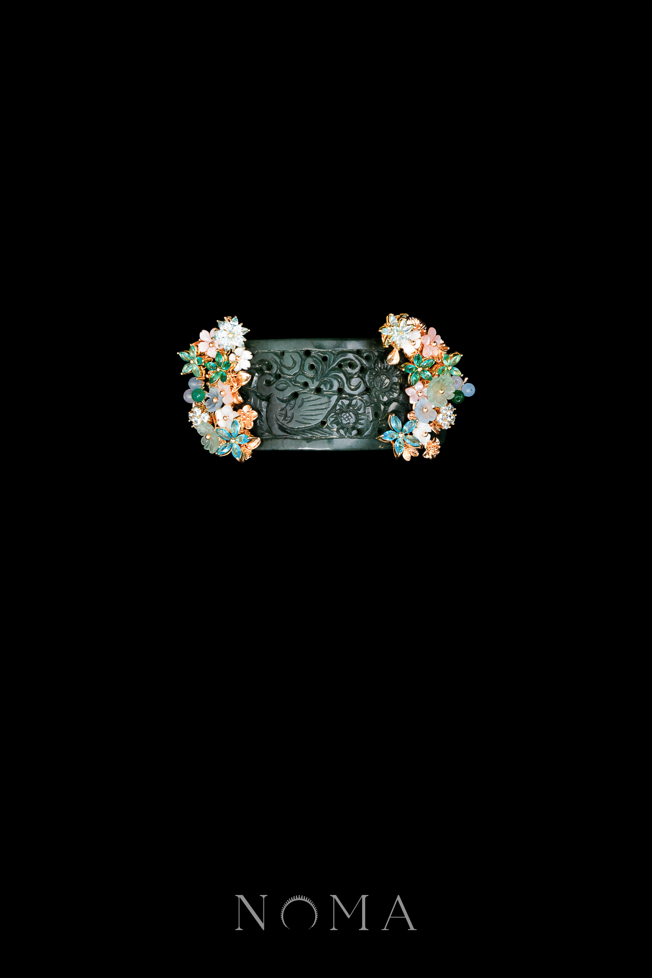 Carved Peacock Floral Turquoise Jade Cuff – Gold, Jade