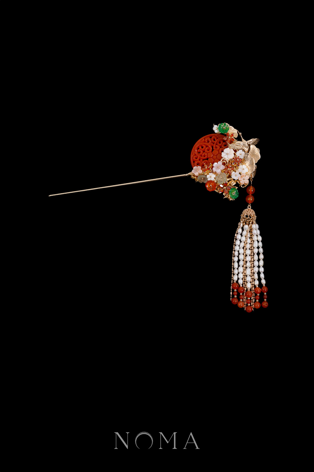 Carved Jade Crane Ginkgo Hairpin – Gold, Red Jade (Left)