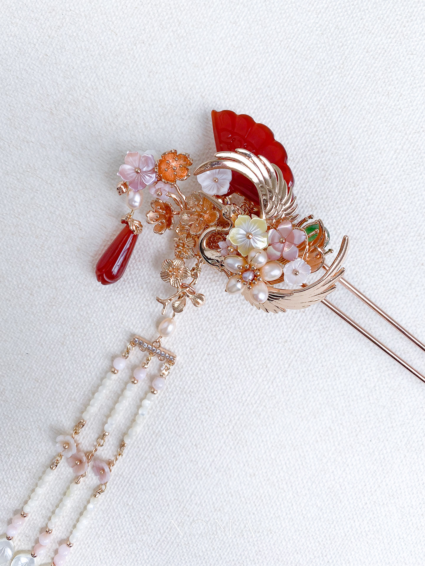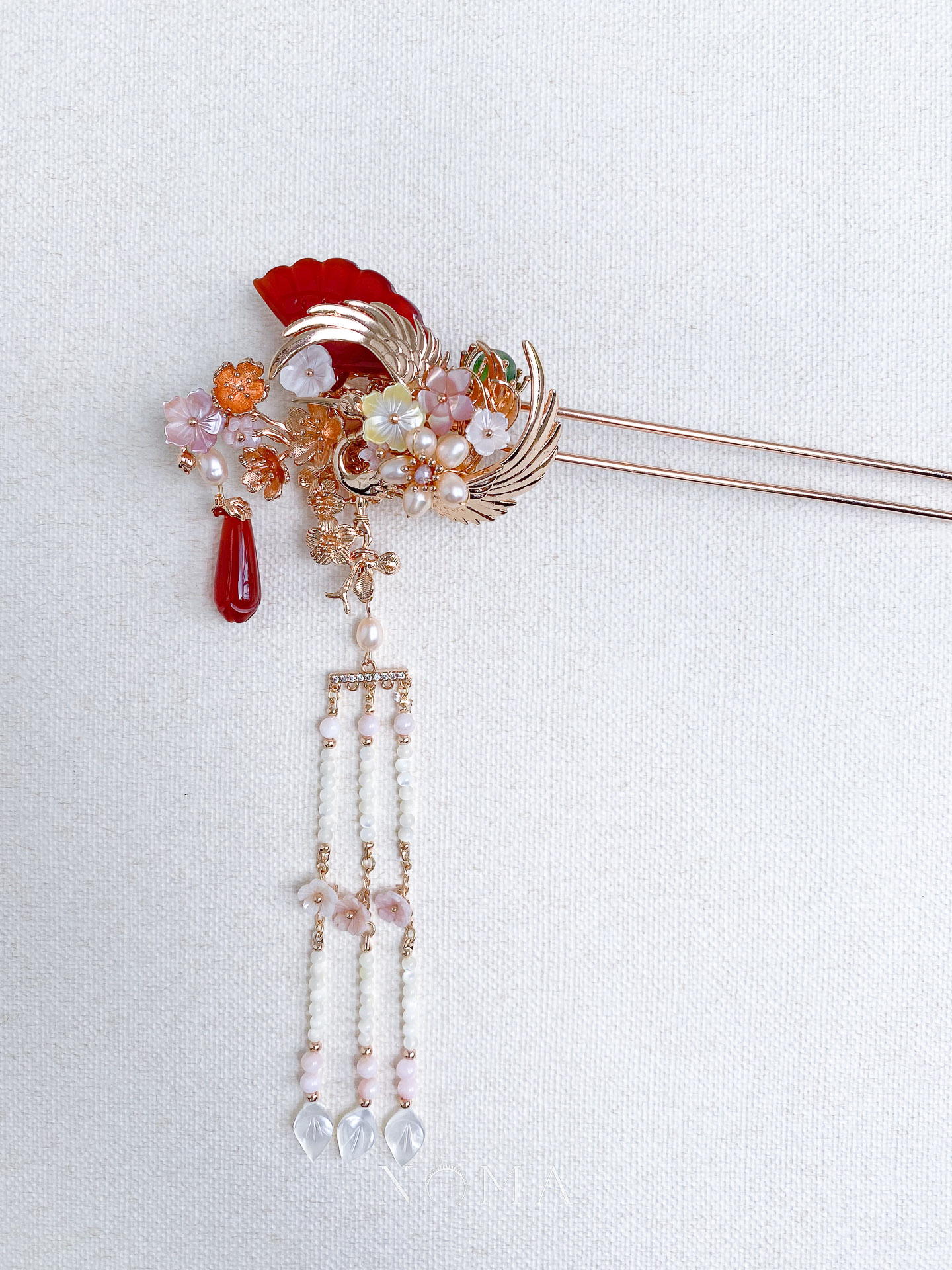 Crane Fan-Shaped Jade Hairpin – Gold, Red