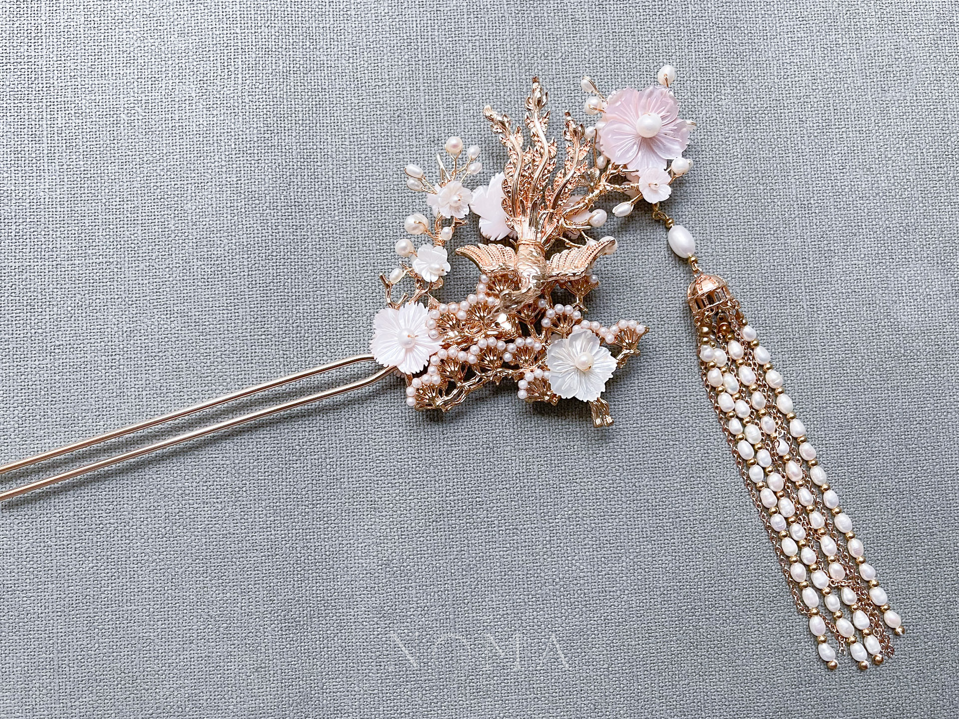 Phoenix Blossom Hairpin – Gold, Pink (Left)