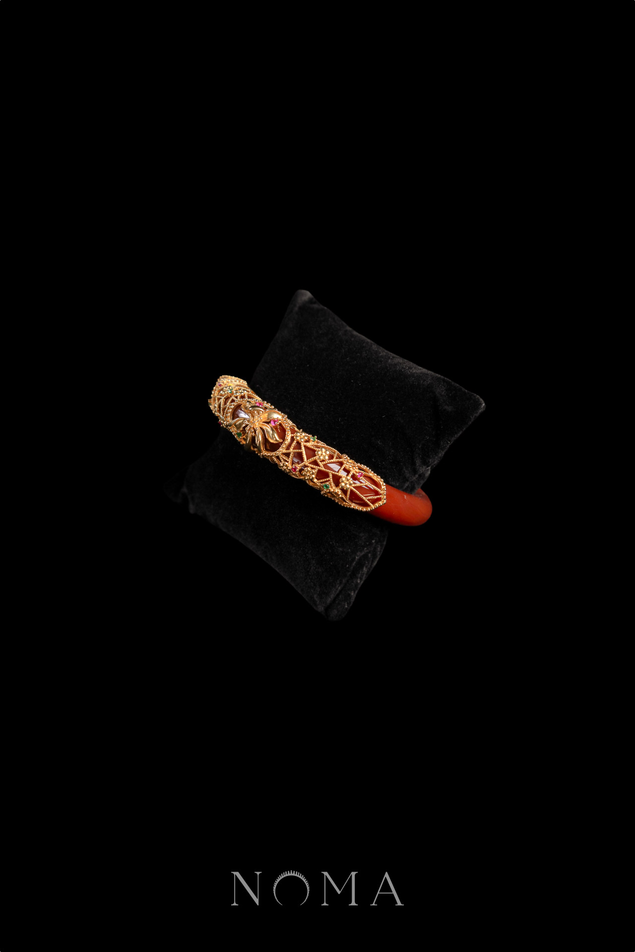Full Floral Ornamental Jade Bangle – Doff Gold, Red Jade