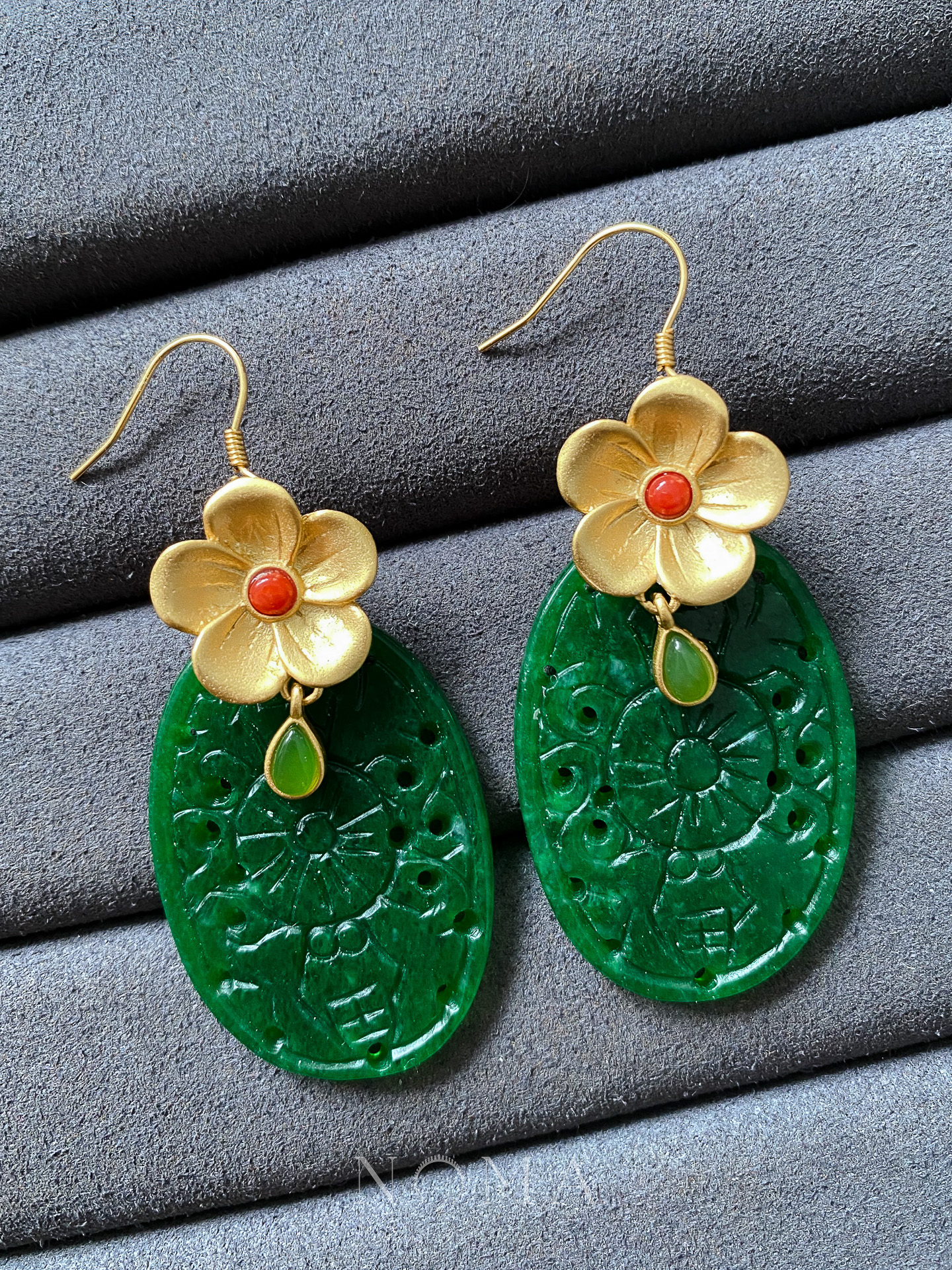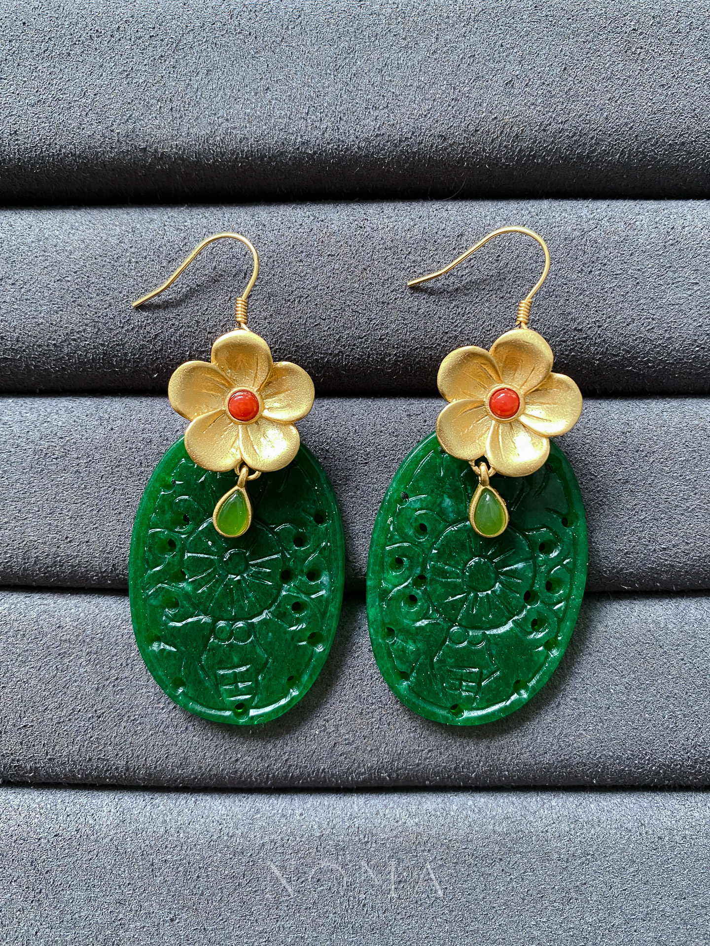 Carved Oval Jade Floral Earrings – 18k Yellow Gold, Jade