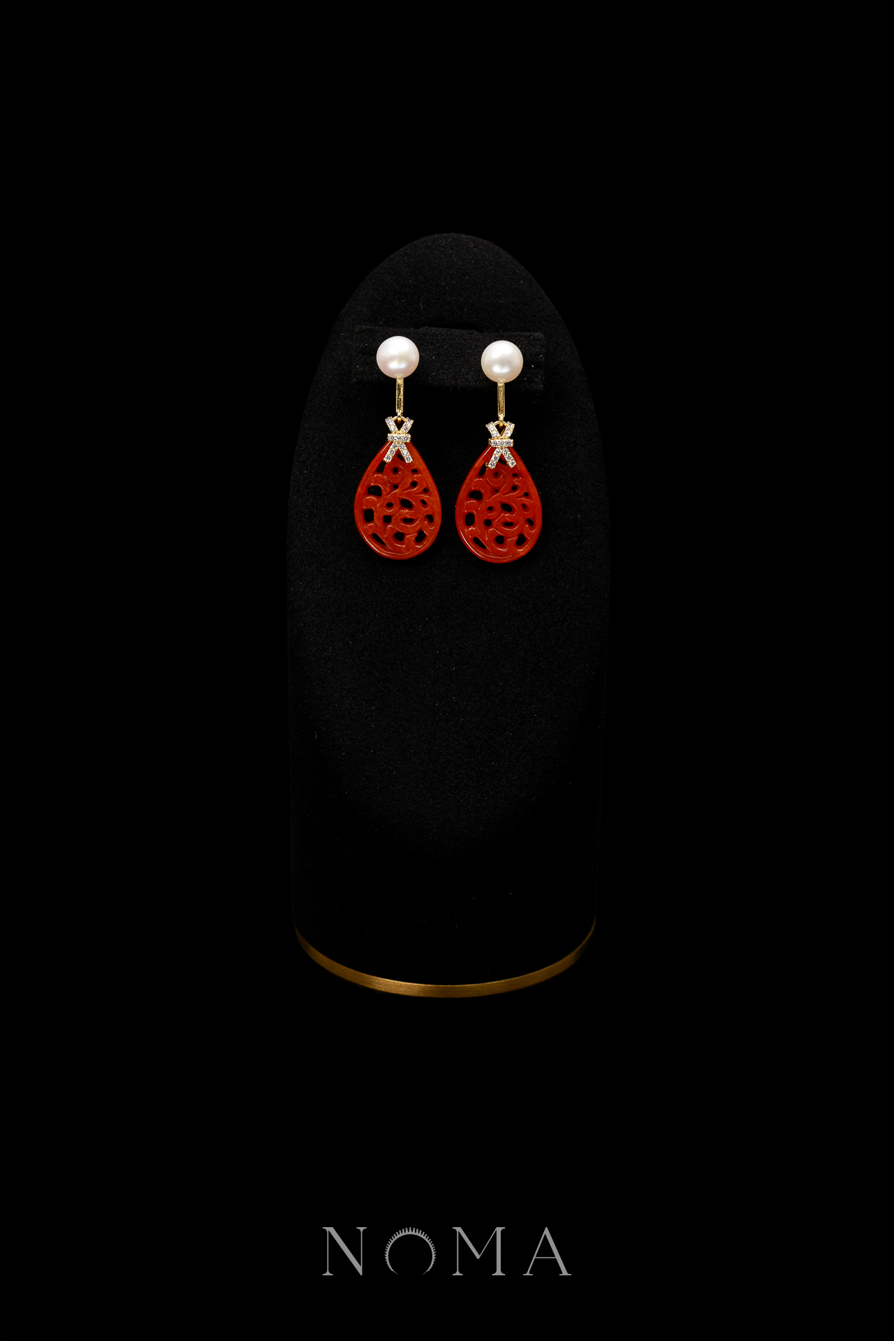 Carved Teardrop Small Jade with Pearl Earrings – 18k Yellow Gold, Red Jade