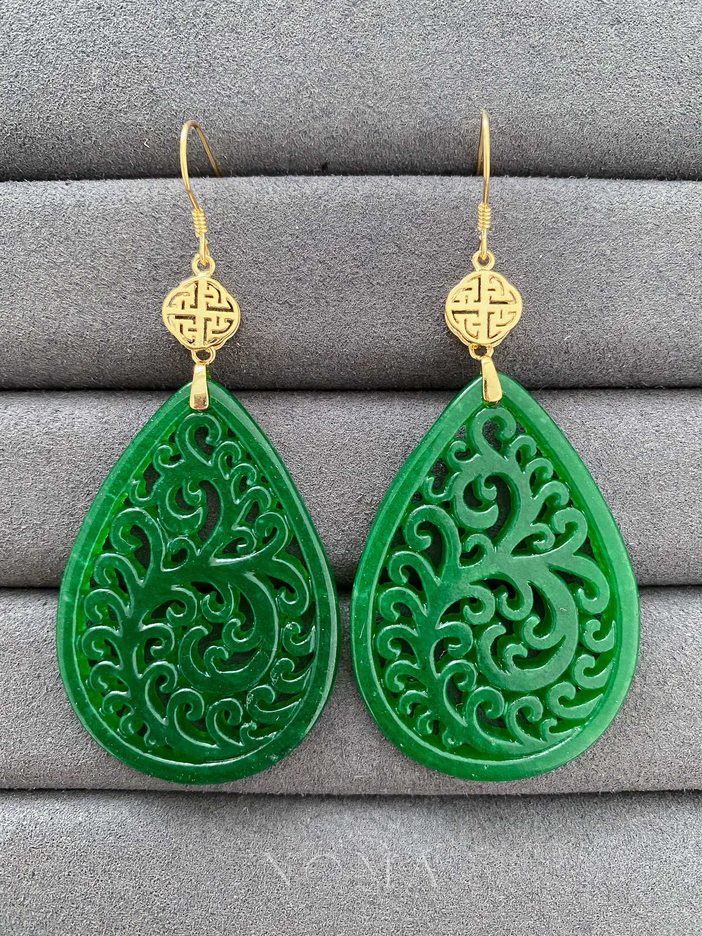 Double Happiness Carved Teardrop Jade Earrings – 18k Yellow Gold, Jade