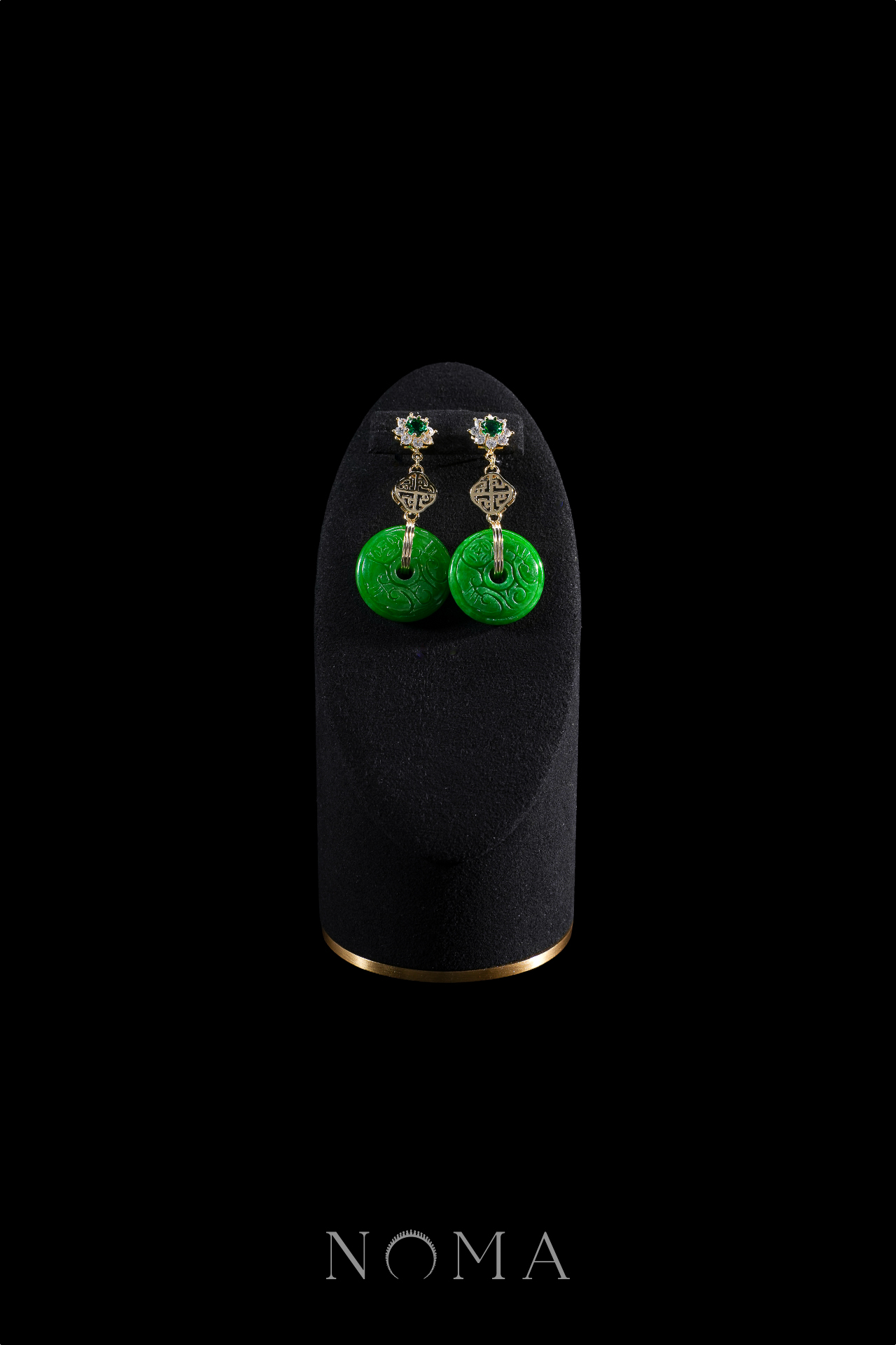 Round Paved Happiness Carved Donut Jade Earrings – 18k Yellow Gold, Jade