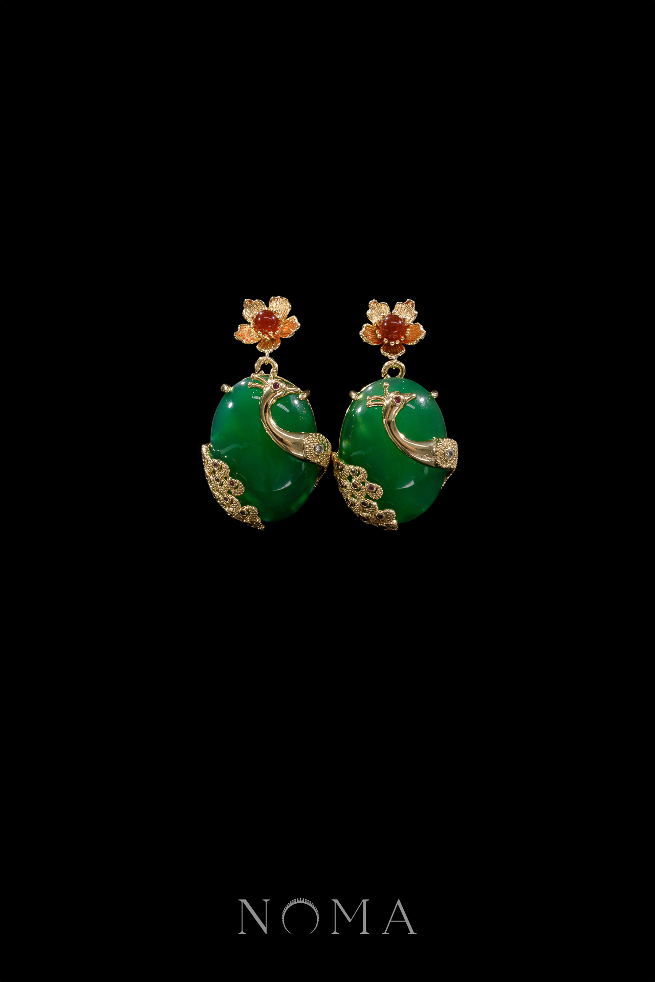 Little Flower Peacock Oval Jade Earrings – 18k Yellow Gold, Jade