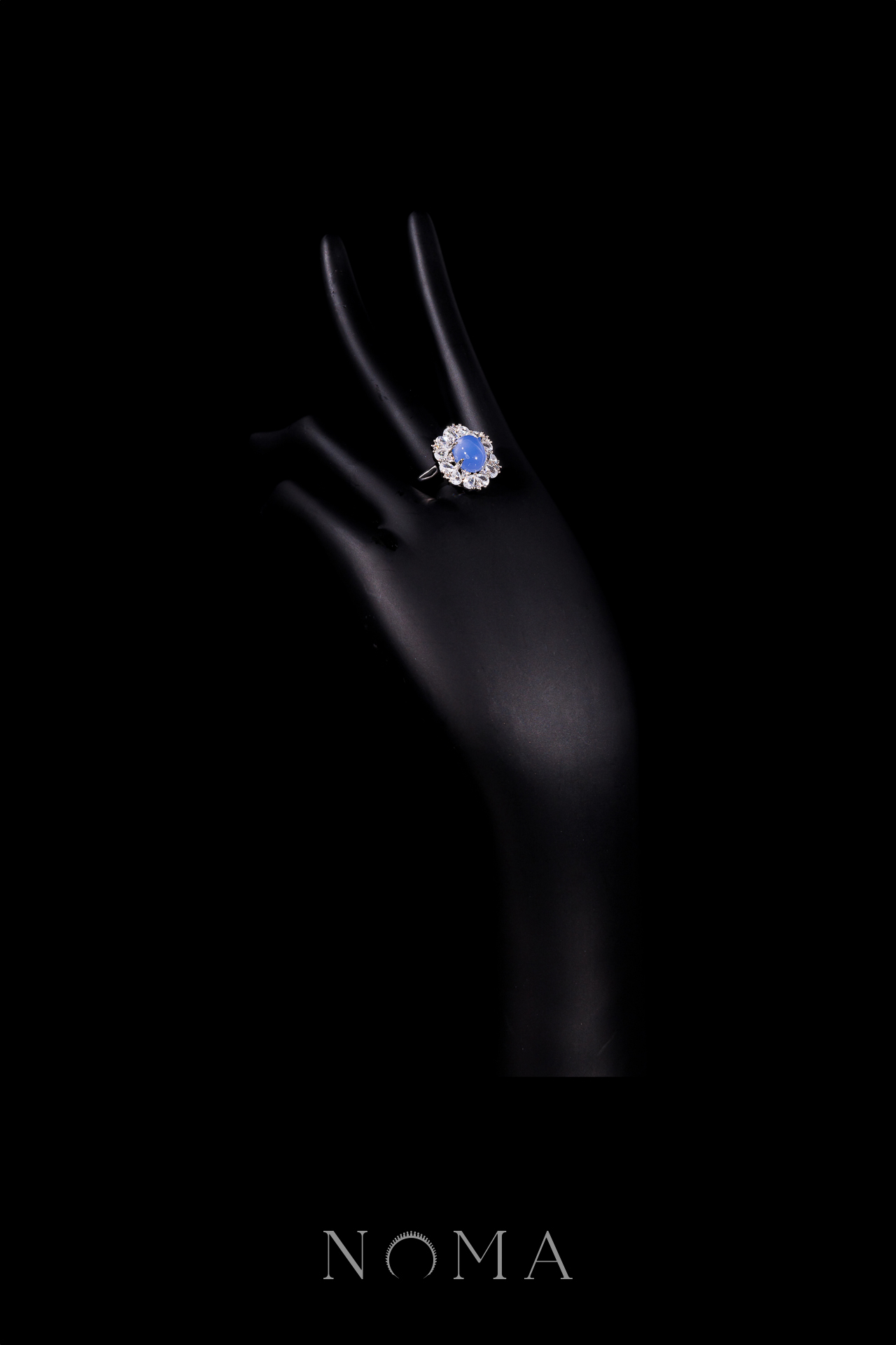 Oval Jade Pear Deco Ring – Rhodium White Gold, Blue Jade