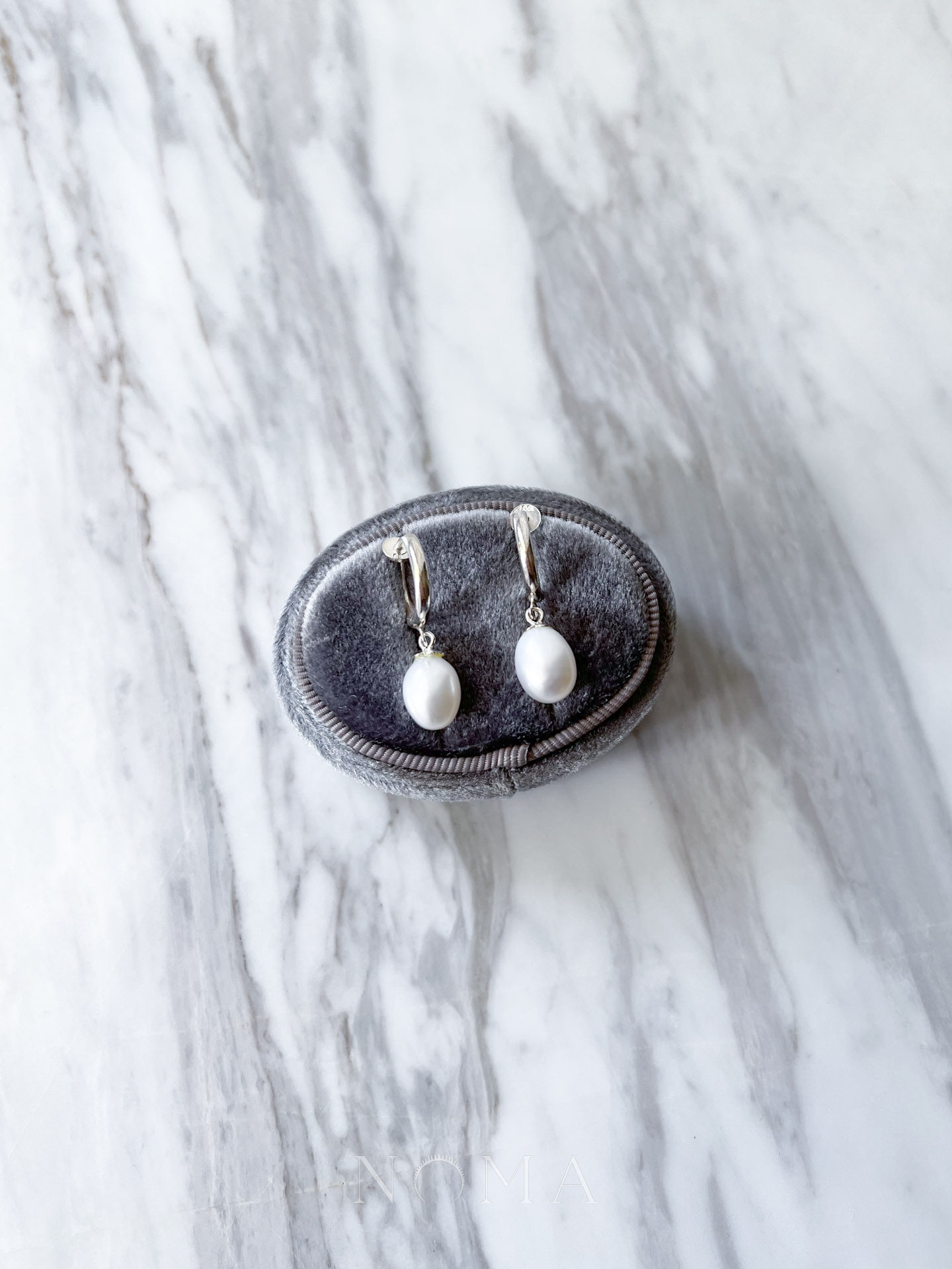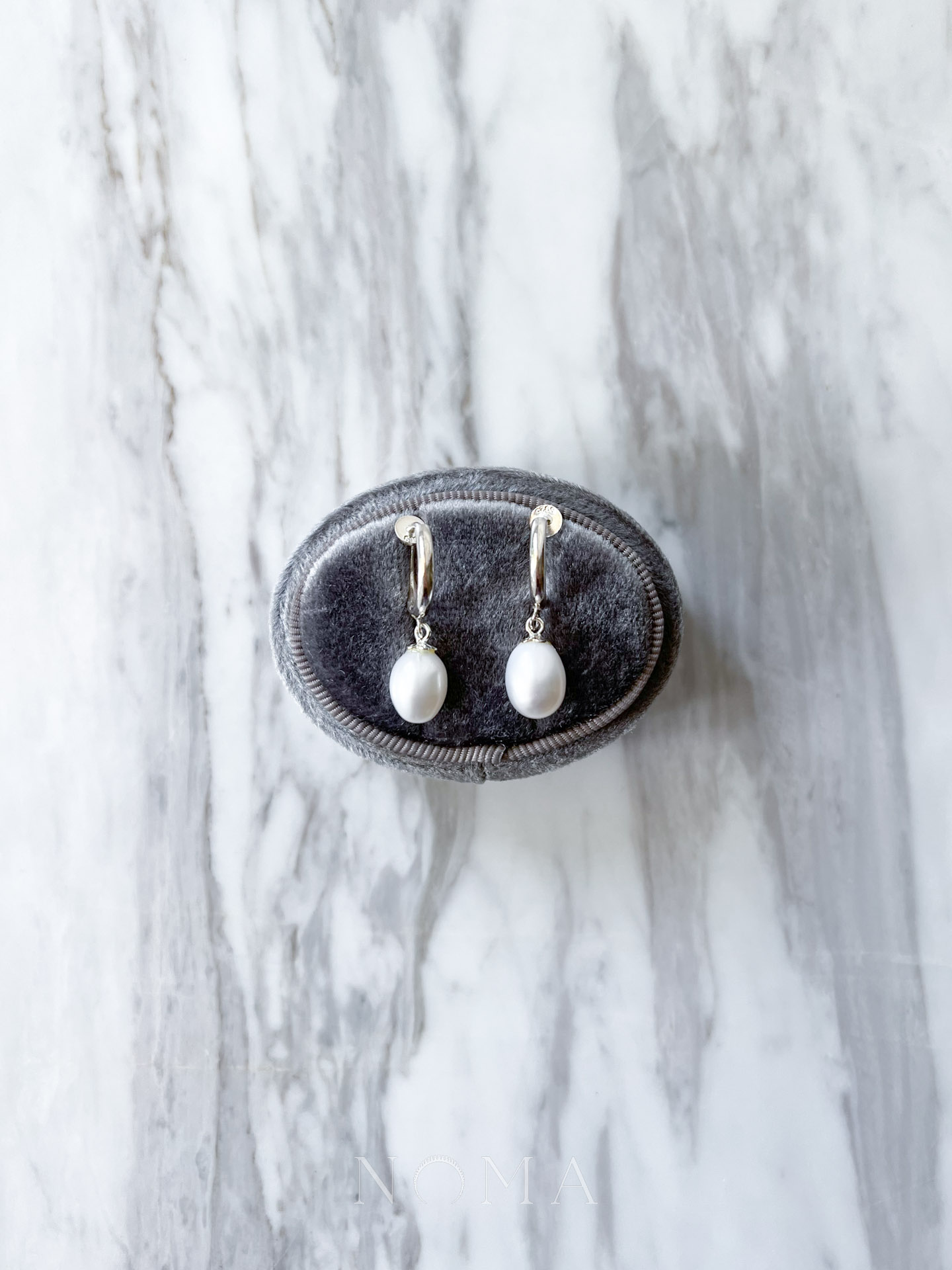 Pearl Drop Oval Earrings – Unplated Silver, White Pearl