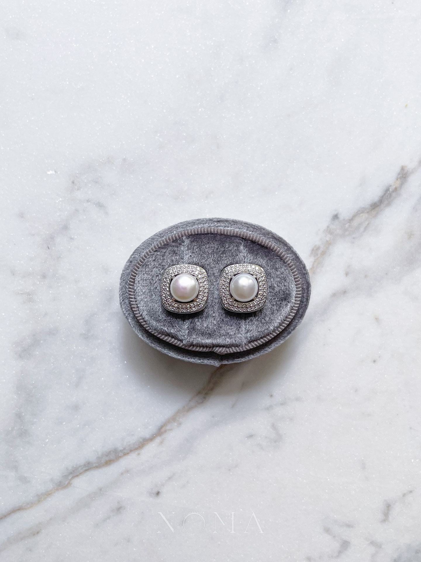 Pearl Cushion Bezel Earrings 8 mm – Rhodium White Gold, White Pearl