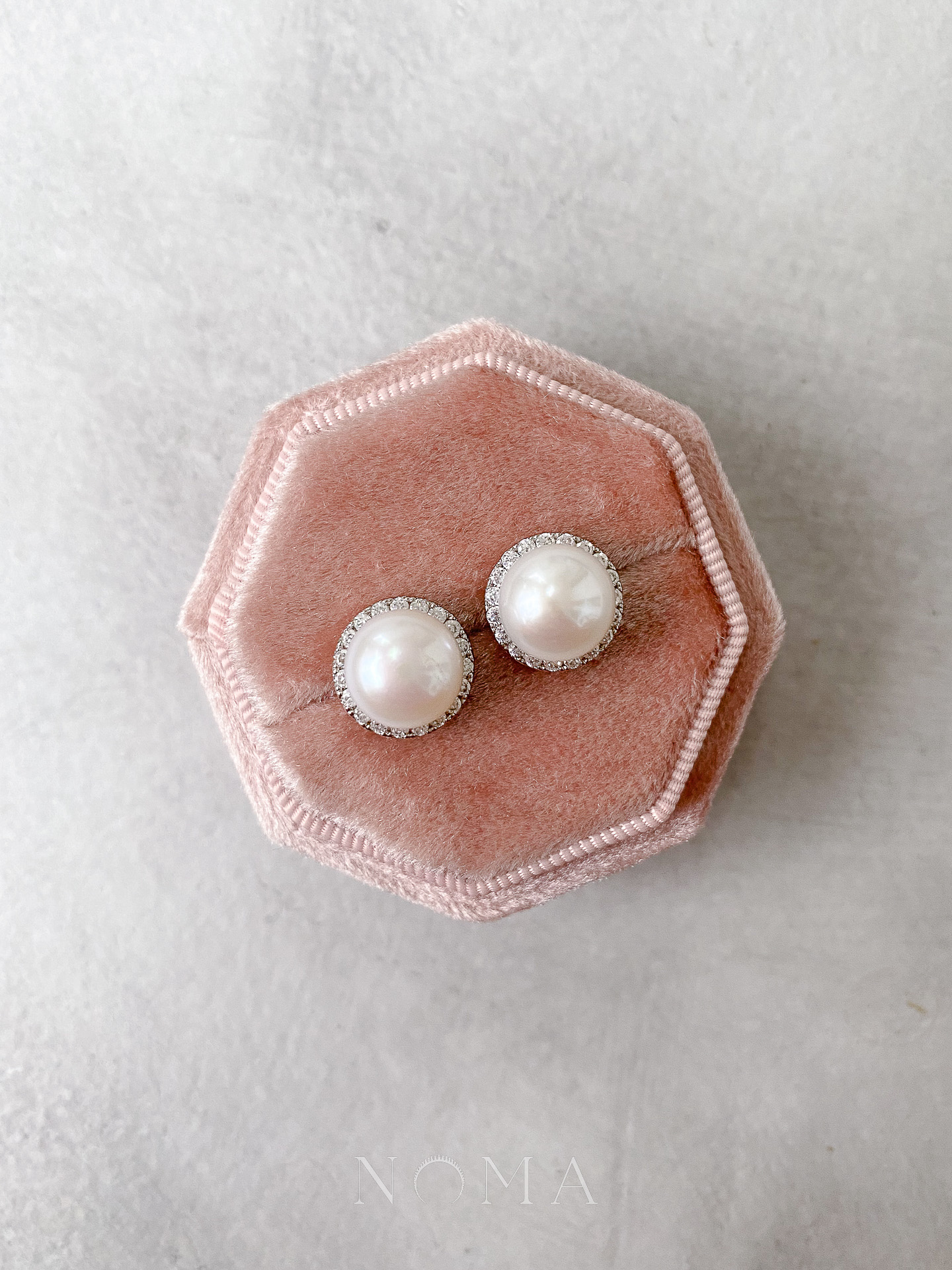 Pearl M Halo Detachable Earrings Set – Rhodium White Gold, White Pearl (4 pcs)