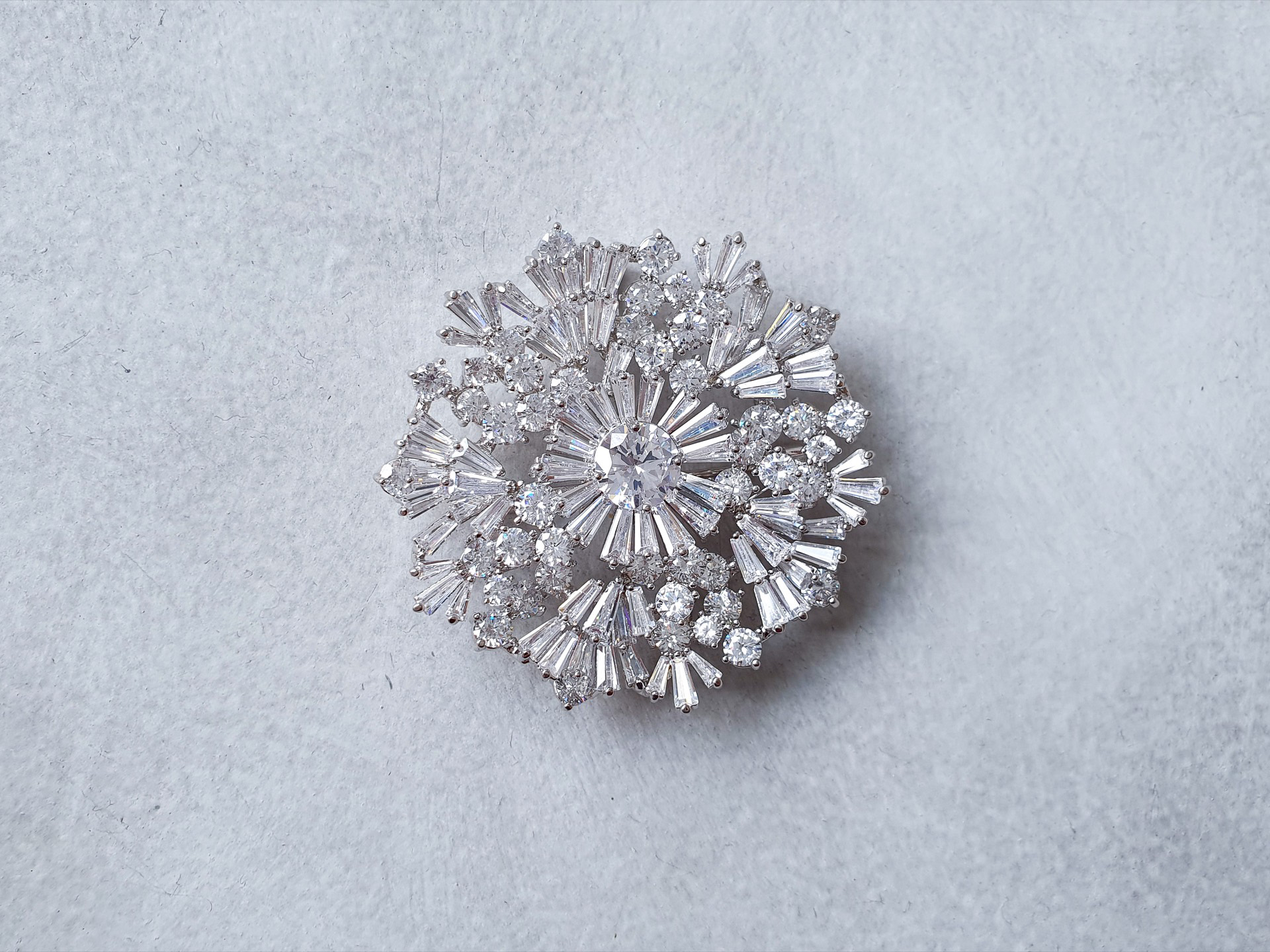 Faceted Round Brooch – Rhodium White Gold, White Diamond