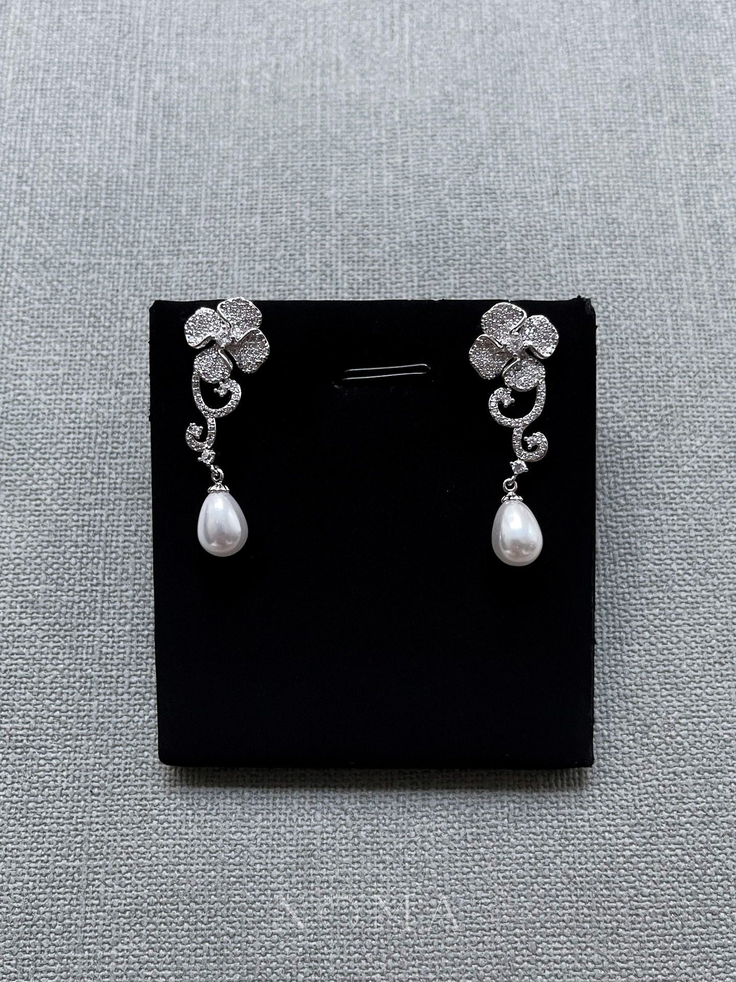 Paved Flower Pearl Earrings – Rhodium White Gold, White Pearl