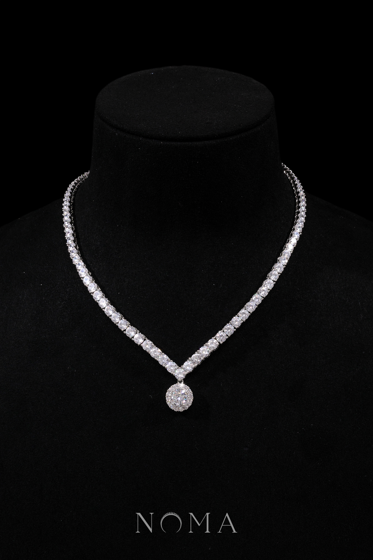 V Round 0.25 ct Tennis Choker with Classic Round Halo Pendant – Rhodium White Gold